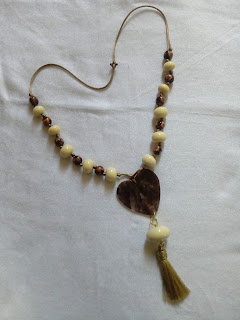 Collar con cordón de cola de ratón, flecos y cabuchón en color dorados, bolas jaspeadas en colores marrones de madera, bolas mas grandes en color beige, así cómo una pieza de plástico duro jaspeado en colores marrones.